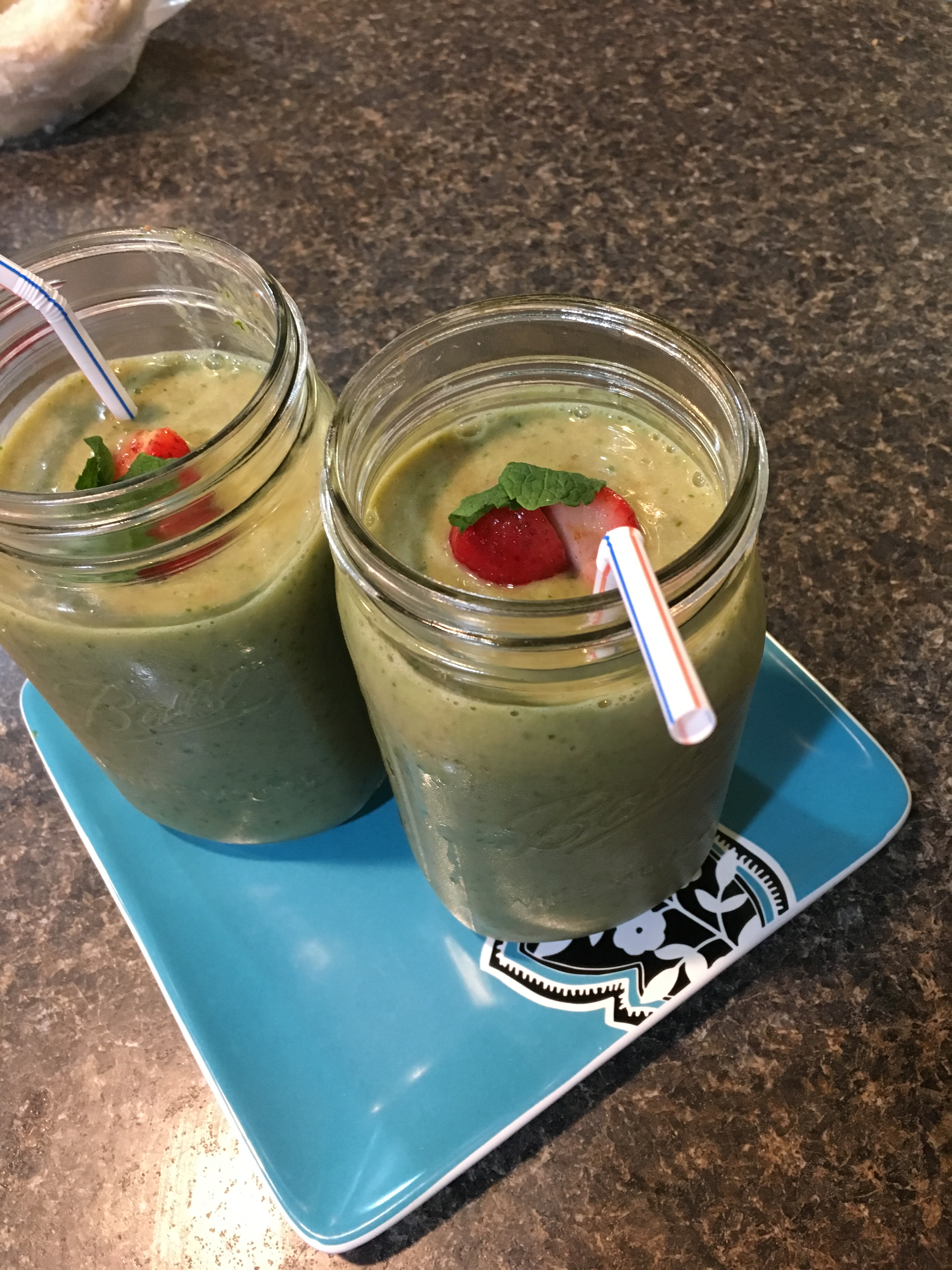 After ditching sugar for 21 days, this was the perfect “feel good” dinner. Frozen bananas, frozen strawberries, fresh kale, vanilla stevia and almond milk. Then I garnished it with strawberries and fresh mint leaves.